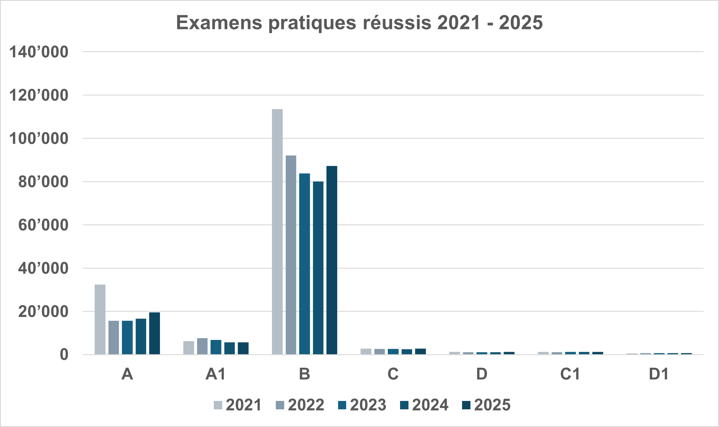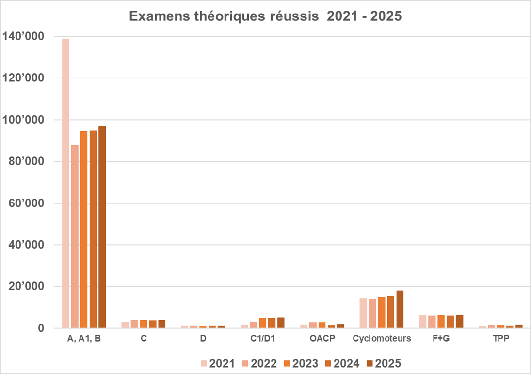 L'évolution du nombre d'examens de conduite en Suisse indique une normalisation dans toutes les catégories en 2025. Le nombre d'examens théoriques et pratiques de conduite passés dans les services cantonaux des automobiles en 2020 et 2021 avait été nettement supérieur à la moyenne des années précédentes. Cette augmentation au cours de ces deux années s'explique par les nouvelles dispositions légales relatives à l'obtention des permis motos, aux modifications apportées dans la formation en deux phases pour les nouveaux conducteurs et à la « conduite dès 17 ans ».