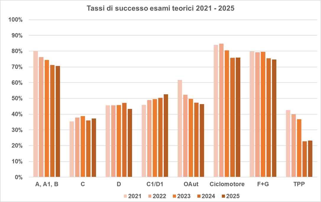 Per le categorie professionali si delinea un quadro simile. Di particolare rilievo il tasso di successo ridotto nell’esame teorico per il trasporto professionale di persone (TPP) che, nonostante un leggero incremento, continua a mantenersi su livelli piuttosto bassi.