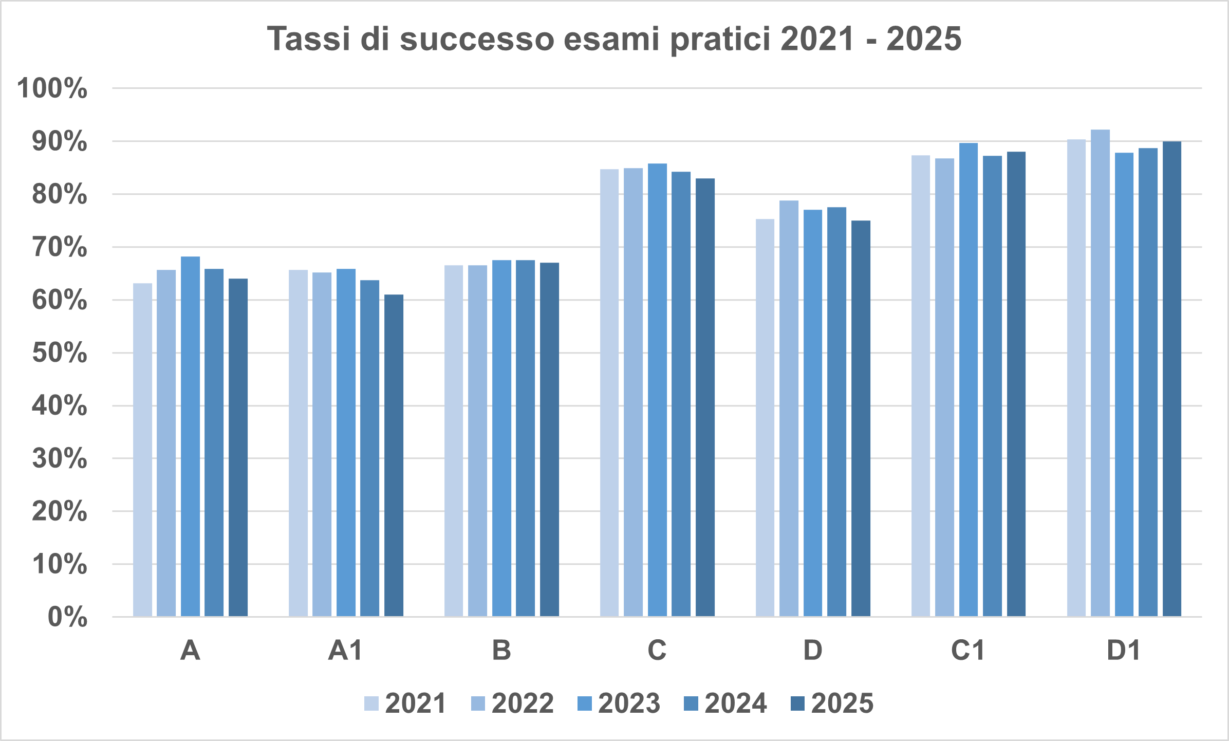 Anche il tasso di successo dell’esame teorico per la categoria M – necessario per i ragazzi a partire dai 14 anni alla guida di ciclomotori, e-bike fino a 45km/m, monopattini elettrici ed e-bike lente – si avvicina a quello del 2024 e, quindi, è sensibilmente inferiore rispetto ai numeri dei precedenti anni.