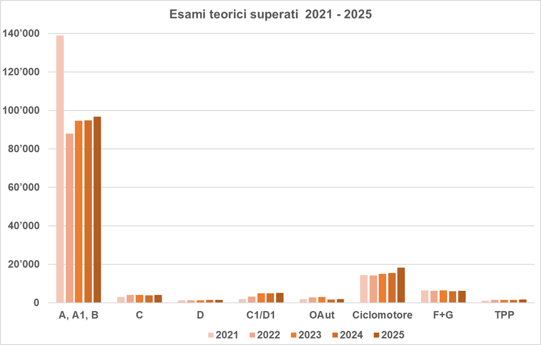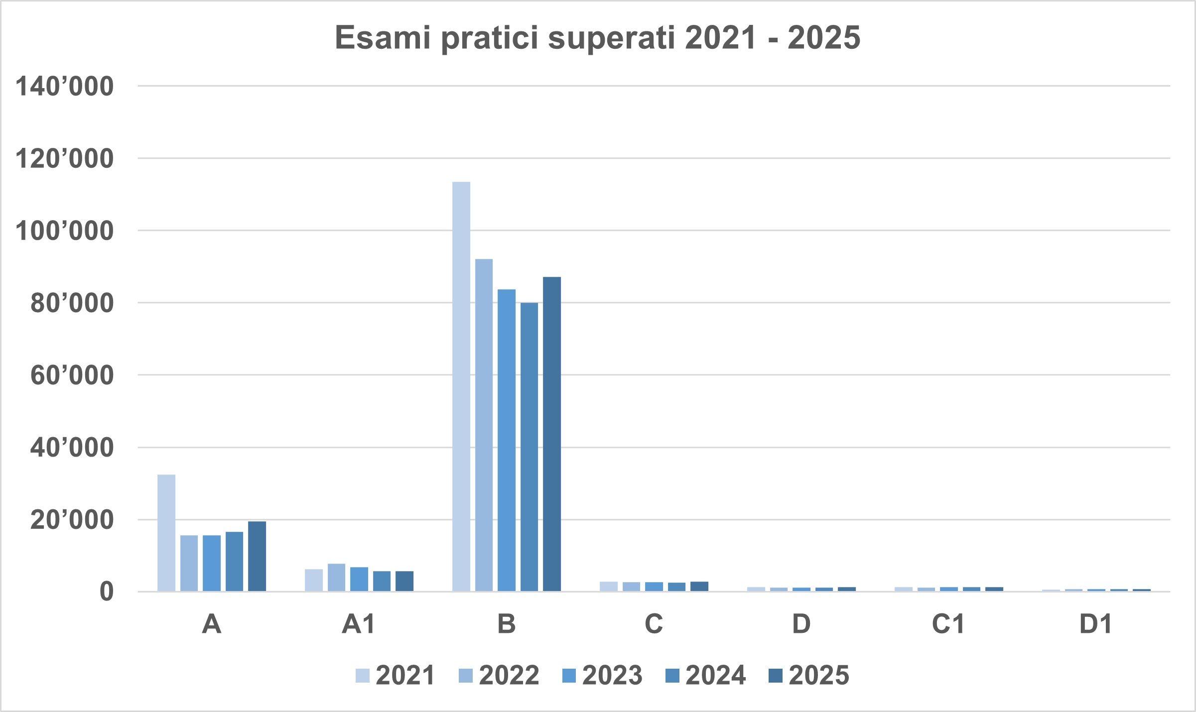 Nel 2025 continua a salire il numero degli esami pratici sostenuti con successo nella categoria B (automobili). Il rialzo a oltre 87 000 esami superati segna un valore significativo, anche se ancora circa 5000 esami sotto la media pluriennale. Il numero elevato di esami teorici di base sostenuti nel passato anno conferma la previsione di un’ulteriore ascesa numerica.