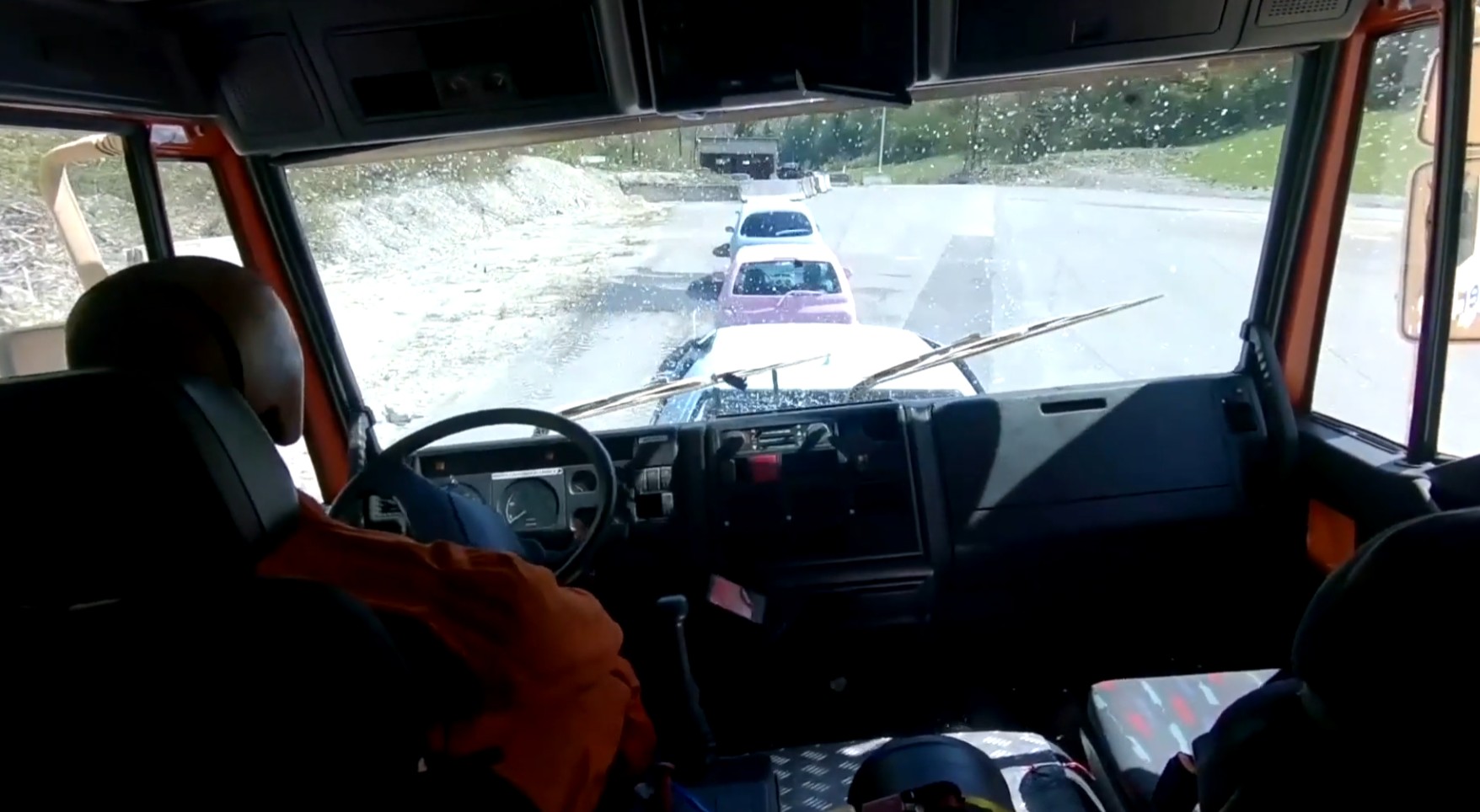 Confronto filmato degli spazi di arresto durante la frenata di emergenza tra veicoli pesanti di vario tipo e veicoli leggeri come automobili, fuoristrada, moto da enduro e moto sportive.